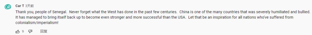 网友Car T的话,代表了不少网友的心声:“永远不要忘记西方在过去几个世纪里做了什么。中国是众多遭受严重羞辱和欺凌的国家之一,但中国已经重新站了起来,并且变得更加强大。(中国的成功)对所有曾遭受殖民主义和帝国主义之苦的国家有启发意义!”