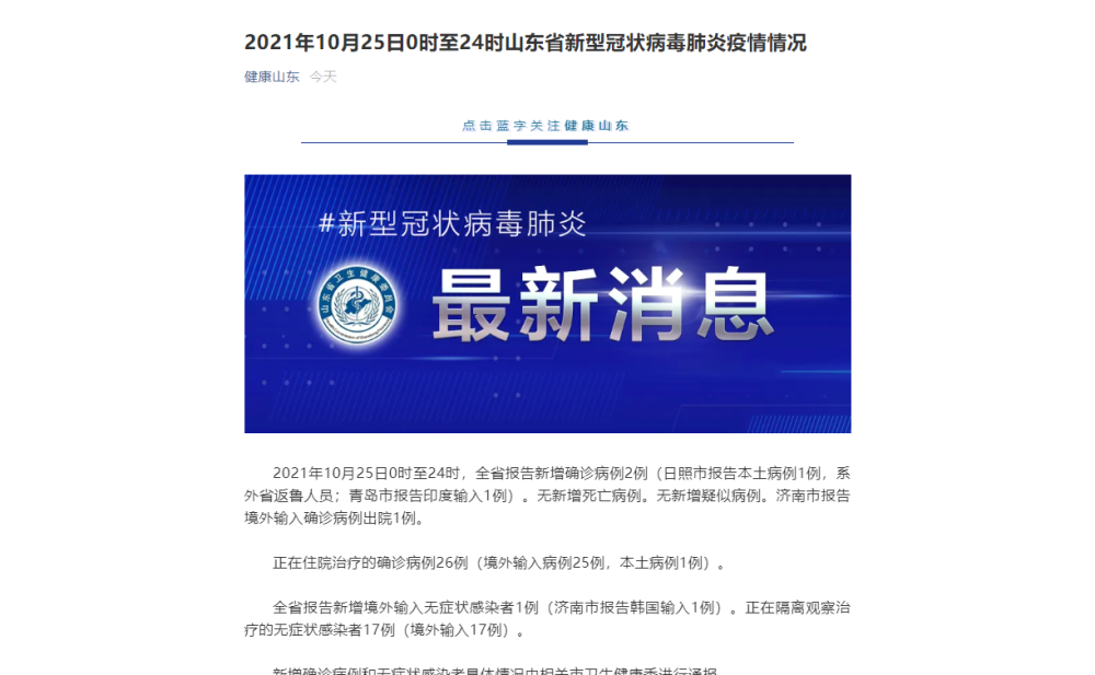 2021年10月25日0时至24时,全省报告新增确诊病例2例(日照市报告本土病例1例,系外省返鲁人员;青岛市报告印度输入1例)。无新增死亡病例。无新增疑似病例。济南市报告境外输入确诊病例出院1例。