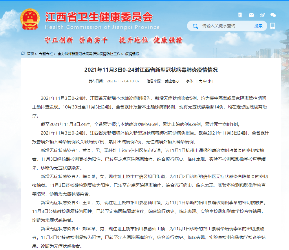 2021年11月3日0-24时,江西省无新增本地确诊病例报告,新增无症状感染者5例,均为集中隔离或居家隔离管控期间主动排查发现。10月30日至11月3日24时,全省累计报告本土确诊病例6例,现有无症状感染者14例,均在定点医院隔离治疗。