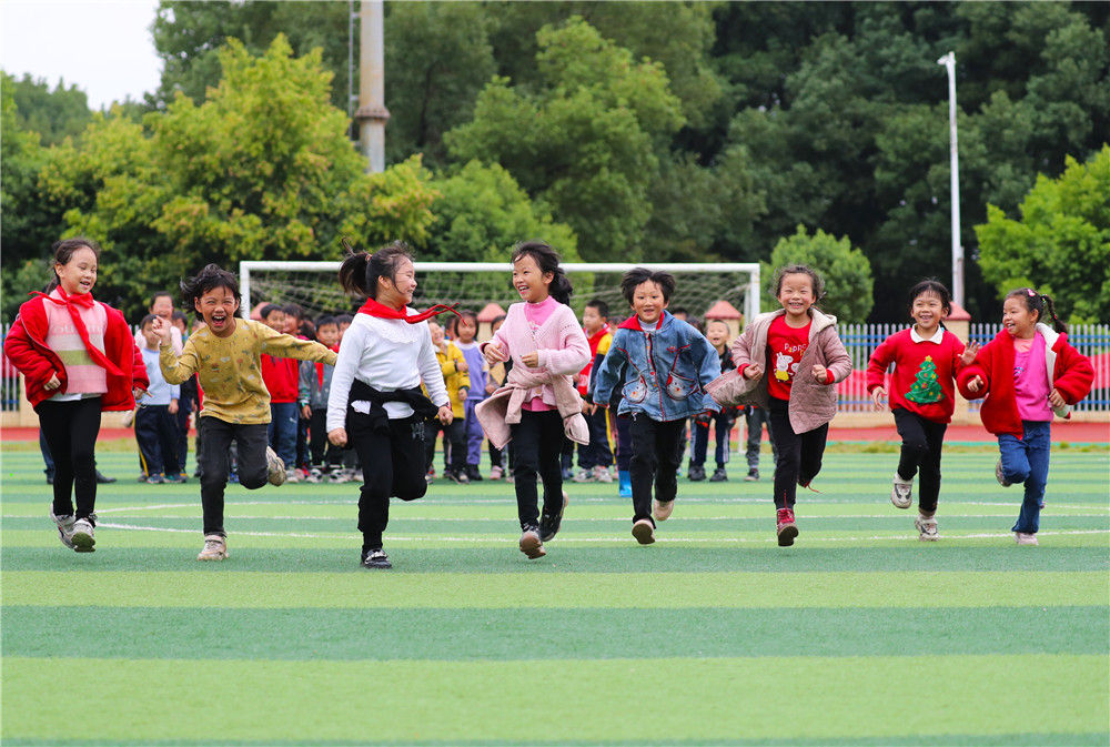 11月4日,在湖南省永州市新田县双碧小学,孩子们在运动场上做游戏。今年秋季学期开学以来,各地积极落实“双减”政策,利用课后服务时间开展内容丰富、形式多样的课外活动,促进学生全面发展。新华社发(刘贵雄摄)