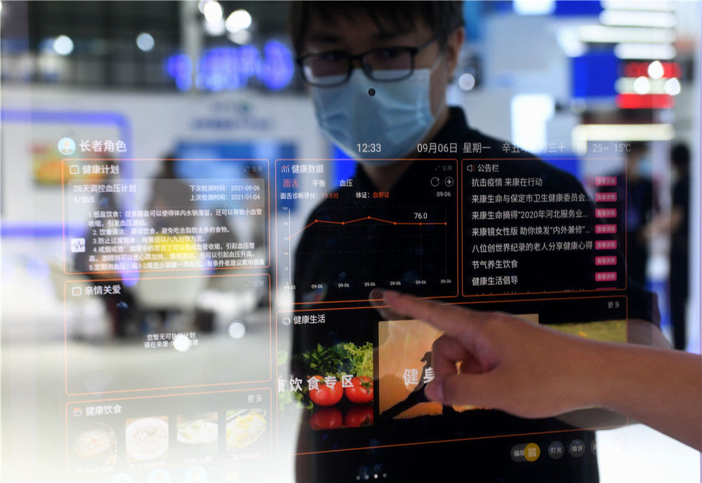 9月6日至8日,2021中国国际数字经济博览会在河北石家庄举行。这是工作人员在博览会上操作智能镜子(9月6日摄)。新华社记者 王晓 摄