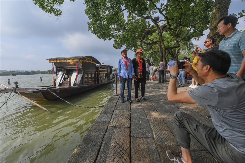 两名老党员在浙江嘉兴南湖湖心岛停泊的南湖红船旁拍照留影(7月1日摄)。新华社记者 徐昱 摄