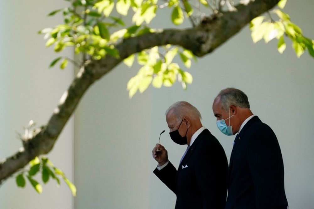 10月20日,在美国首都华盛顿,美国总统拜登(左)准备离开白宫。(新华社发,沈霆摄)