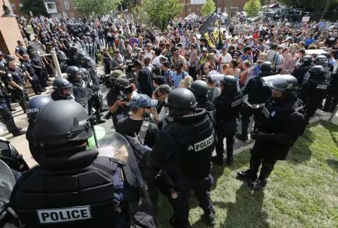 主导11晚游行示威的是白人种族主义者,他们手举火把高喊“一个种族,一个国家,停止移民”的口号(one people,one nation, end immigration ),由于反对游行者的加入,双方由口角转为斗殴,警方迅速赶到驱散了人群并将本次集会定义为非法。但事态并未就此平息,12日周六弗吉尼亚州夏洛茨维尔市的游行示威仍在继续,弗吉尼亚州州长已经宣布该市进入紧急状态。