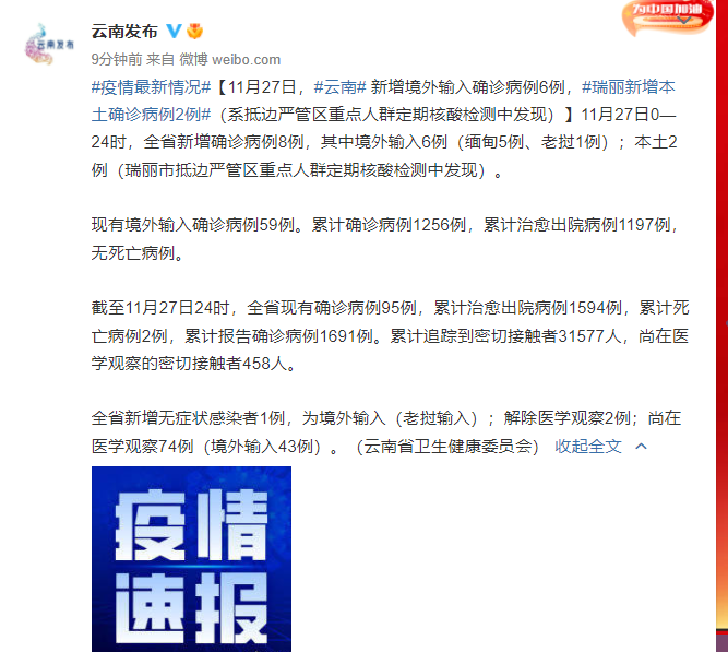11月27日0—24时,云南省新增确诊病例8例,其中境外输入6例(缅甸5例、老挝1例);本土2例(瑞丽市抵边严管区重点人群定期核酸检测中发现)。