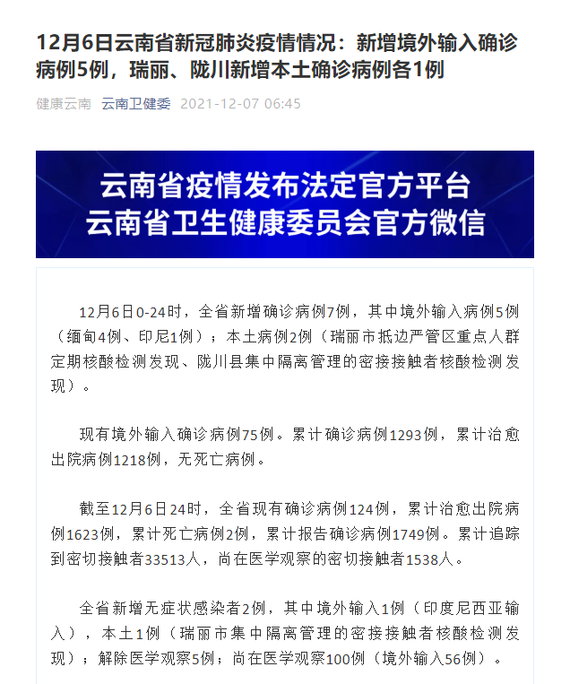 12月6日0-24时,全省新增确诊病例7例,其中境外输入病例5例(缅甸4例、印尼1例);本土病例2例(瑞丽市抵边严管区重点人群定期核酸检测发现、陇川县集中隔离管理的密接接触者核酸检测发现)。