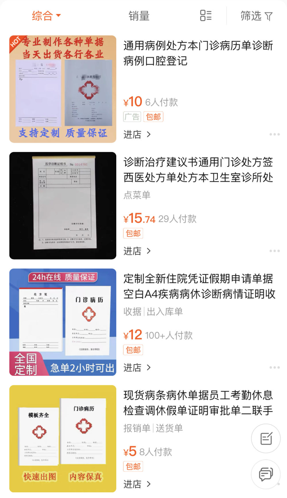 “260元一张死亡证明,130元一张病危通知书,专业医师现做现盖章,保真。”电商平台上,一家经营定制“门诊病历”的网店客服向记者介绍了这些没有写在产品介绍里的业务。记者近日调查发现,只要花上一两百元,就能在网上轻松买到“死亡证明”“病危通知书”“手术通知单”“医学出生证明”等重要文书,令人不寒而栗。