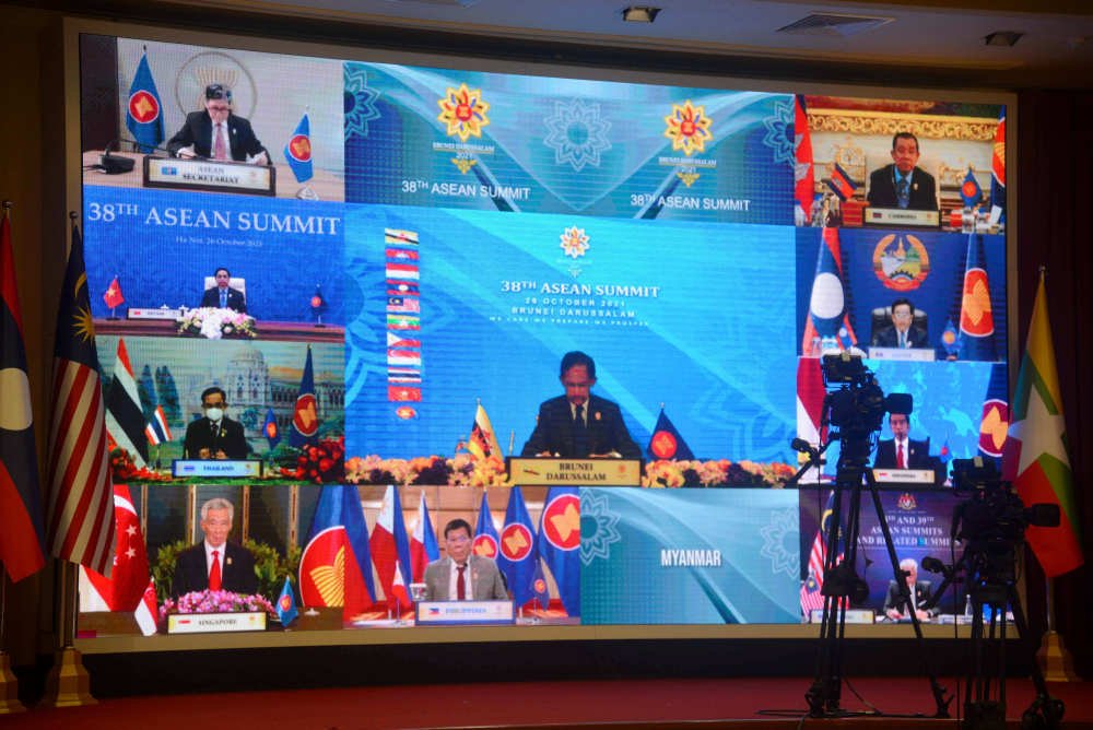 10月26日在文莱首都斯里巴加湾市拍摄的东盟峰会视频会议现场。(新华社记者薛飞摄)