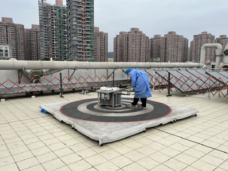 无人机的起飞地点位于罗湖中医院门诊楼前广场,莲塘各采样点的核酸标本收集后统一送至起飞点运送。