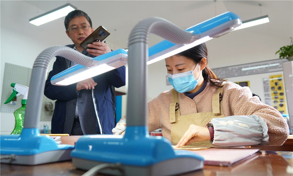 在四川省洛带艺匠古籍文献修复博物馆,一名参观者拍摄古籍文献修复师的工作过程(2019年12月26日摄)。新华社记者 王曦 摄