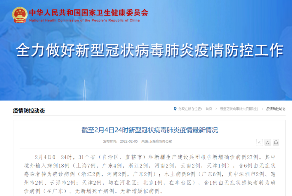 2月4日0—24时,31个省(自治区、直辖市)和新疆生产建设兵团报告新增确诊病例27例。其中境外输入病例18例(上海7例,广东4例,浙江2例,河南2例,云南2例,天津1例),含6例由无症状感染者转为确诊病例(浙江2例,河南2例,广东2例);本土病例9例(广东6例,其中深圳市2例、惠州市2例、云浮市2例;天津2例,均在河北区;北京1例,在丰台区),含1例由无症状感染者转为确诊病例(在广东)。无新增死亡病例。无新增疑似病例。