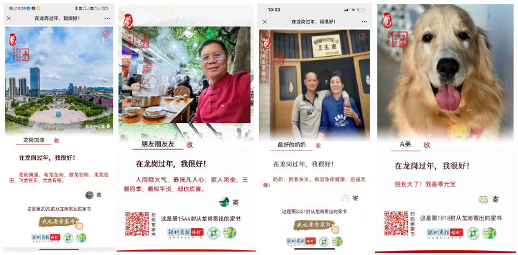 家书传情,相聚云端。疫情下的春节,显得十分特别,许多市民都有着同样的选择——在深过年。因此龙岗区卫健局化身“邮递员”,通过H5、图文等多种新媒体形式,借力全媒体矩阵渠道,倡议大家在深过年、就地过年,也让广大市民通过本次活动向亲朋好友致以问候、祝福。1月26日南方小年这一天,该款电子家书正式上线,以家书为载体,以市民为依托,以深圳龙岗为原点,将春节的美好祝愿辐射至全国。用户扫码后,只需选择背景或上传照片,选择寄语或自定义,即可生成个性化家书。为了方便用户操作,活动方准备了寄语的模板。其中,既有与健康相关的嘱咐,例如:“虎年大吉注健康,三减三健最健康,2022年记得减盐、减油、减糖,健康口腔、健康体重、健康骨骼!”;也有为龙岗抗疫人量身打造的家书模板,例如:“我是一名深圳防疫工作的参与者,愿山河无恙,深圳无疫!让我们一起做健康深圳的守护者吧!”;更有充满祝福的温情话语“新年是一条绵绵的线,一头系着你,一头系着家;祝福是一根长长的绳,一头拴着你,一头拴着我。无论多远,家永远在我心里,祝福永远在我心里!”……当然,用户更可以根据自己的心情,书写独一无二的个性“家书”。而家书中一句“在龙岗过年,我很好!”更反映出深圳这座城市的温暖、包容,折射着深圳飞速的经济发展带给人们生活的变化。