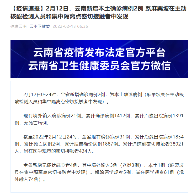 2月12日0-24时,云南省新增确诊病例2例,为本土确诊病例(麻栗坡县在主动核酸检测人员和集中隔离点密切接触者中发现)。