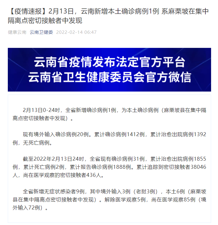 原标题:【疫情速报】2月13日,云南新增本土确诊病例1例 系麻栗坡在集中隔离点密切接触者中发现