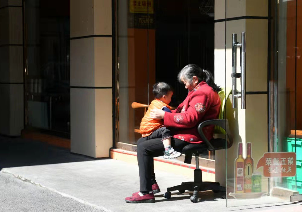 2月11日,水尾村一位老人抱着孙子晒太阳。新华社记者梁旭 摄