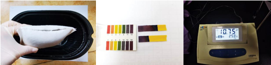 (左.加热完成后加热包变成石块样物质;中.PH试纸条测试加热剩余水;右.PH计测试加热剩余水)