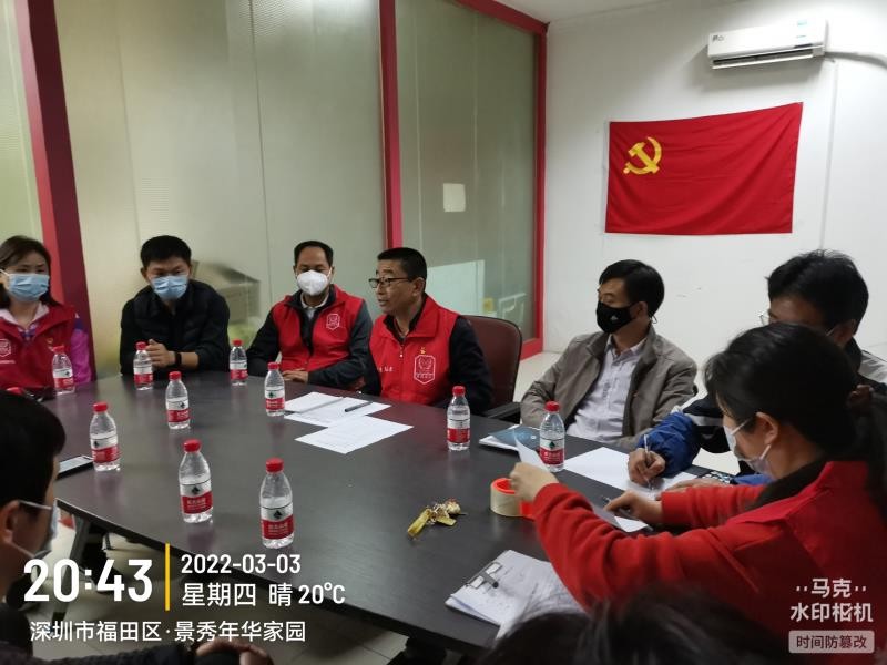 3月3日、3月12日,两次召开党小组会议,会上全体党员重温入党誓词、认真研究党小组工作思路和工作计划,提出了“团结一致、同心抗疫,关爱居民、精细服务”的工作思路。3月12日及时研究贯彻落实深圳11区最新通告,尤其是落实福田区疫情防控指挥部通告(第50号)的相关工作。