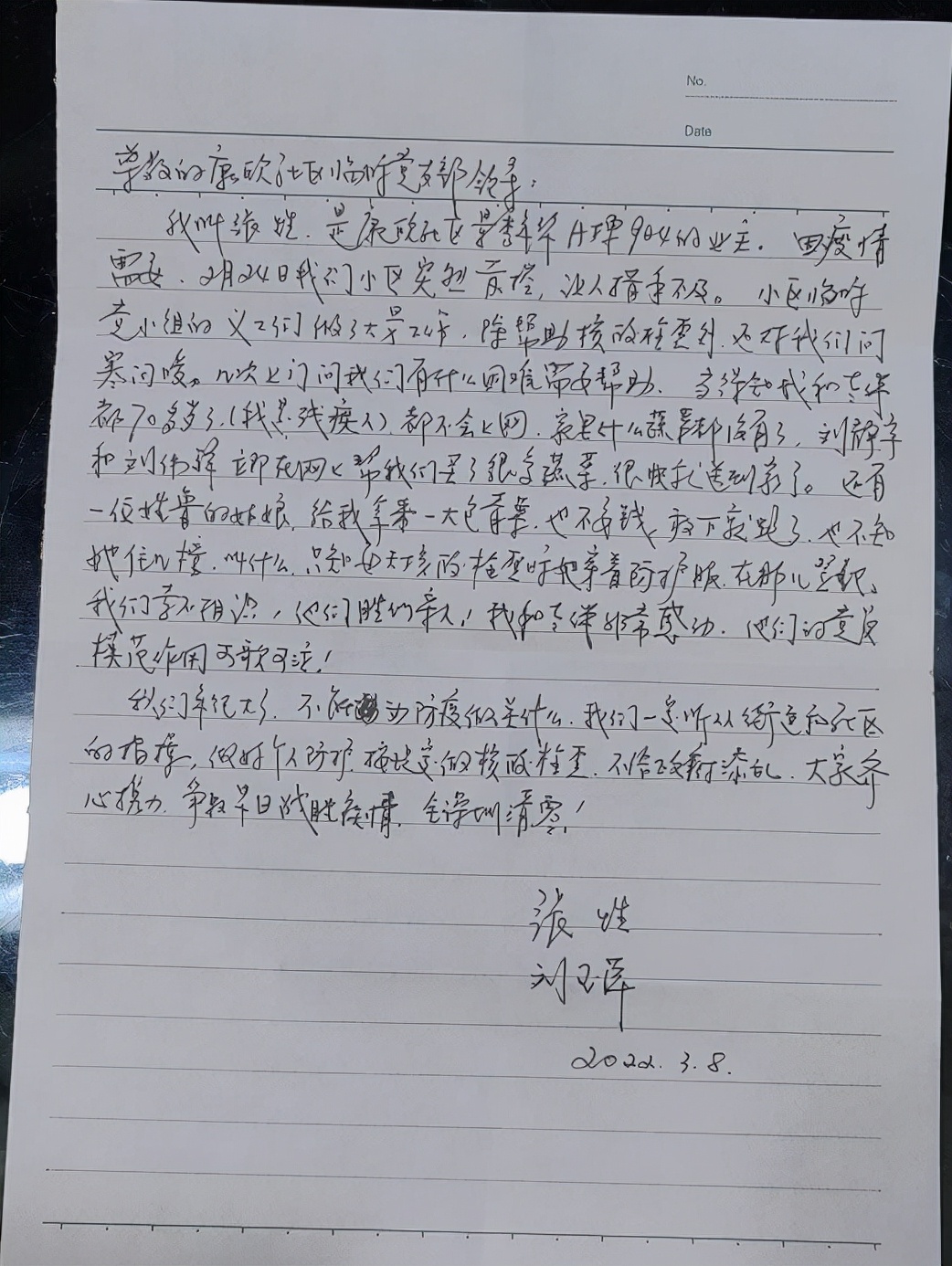 在核酸检测的登记中,有老人家告诉登记的义工“肉吃腻了,想吃青菜,但是不会上网买菜”,当值义工得知这一情况立刻把消息转达给关爱劝导组,关爱劝导组党员志愿者马上帮助老人买菜并送货上门,还发放了“党员志愿者一对一帮助卡”,与老人家结成一对一帮助对象,每天主动询问帮助事项。事后,2位老人还专门写来了感谢信表示感谢。