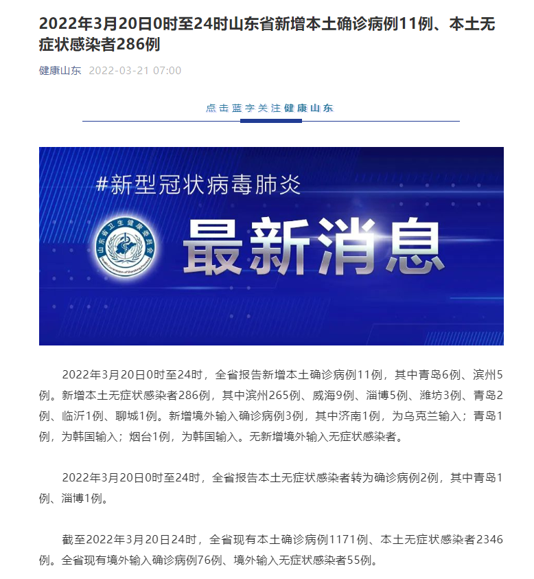2022年3月20日0时至24时,全省报告新增本土确诊病例11例,其中青岛6例、滨州5例。新增本土无症状感染者286例,其中滨州265例、威海9例、淄博5例、潍坊3例、青岛2例、临沂1例、聊城1例。新增境外输入确诊病例3例,其中济南1例,为乌克兰输入;青岛1例,为韩国输入;烟台1例,为韩国输入。无新增境外输入无症状感染者。