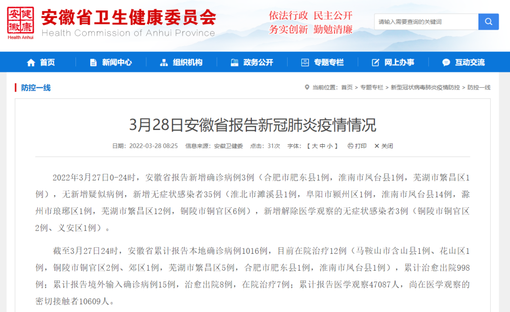 2022年3月27日0-24时,安徽省报告新增确诊病例3例(合肥市肥东县1例,淮南市凤台县1例,芜湖市繁昌区1例),无新增疑似病例,新增无症状感染者35例(淮北市濉溪县1例,阜阳市颍州区1例,淮南市凤台县14例,滁州市琅琊区1例,芜湖市繁昌区12例,铜陵市铜官区6例),新增解除医学观察的无症状感染者3例(铜陵市铜官区2例、义安区1例)。