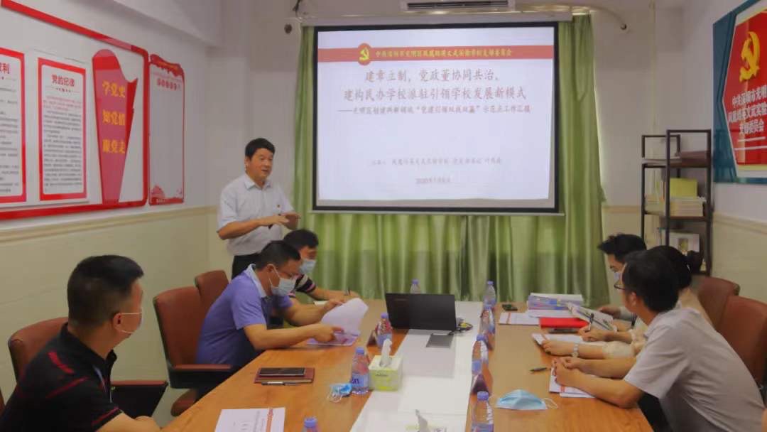 会上,伟波同志汇报了区民办教育系统党建工作的部署情况。伟波同志要求,学校党支部要严格按照区委教育工委有关要求落实党建工作,充分发挥党支部引领作用,规范学校办学行为,重视教师思想建设,促进学校健康发展。同时,伟波同志还勉励学校党支部结合学校实际,会同社区多组织一些有意义有创新形式的活动,加大宣传力度,扩大党组织影响力。凤凰培英文武实验学校郭锡勇副董事长和张欢生校长汇报了学校相关情况。据悉,光明区开展的两新领域“党建引领双战双赢”示范点创建工作进入了最后的检查验收环节。根据前期的评审,凤凰培英文武实验学校成为光明区教育系统唯一入选单位。
