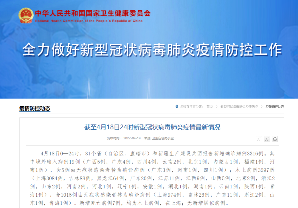 4月18日0—24时,31个省(自治区、直辖市)和新疆生产建设兵团报告新增确诊病例3316例。其中境外输入病例19例(广西5例,广东4例,四川4例,云南2例,北京1例,内蒙古1例,福建1例,河南1例),含5例由无症状感染者转为确诊病例(广东3例,河南1例,四川1例);本土病例3297例(上海3084例,吉林88例,黑龙江64例,广东20例,江苏11例,江西9例,山西5例,北京2例,浙江2例,山东2例,河南2例,河北1例,辽宁1例,安徽1例,湖北1例,湖南1例,云南1例,陕西1例,青海1例),含1015例由无症状感染者转为确诊病例(上海974例,吉林26例,广东11例,浙江2例,山东1例,青海1例)。新增死亡病例7例,均为本土病例,在上海;无新增疑似病例。