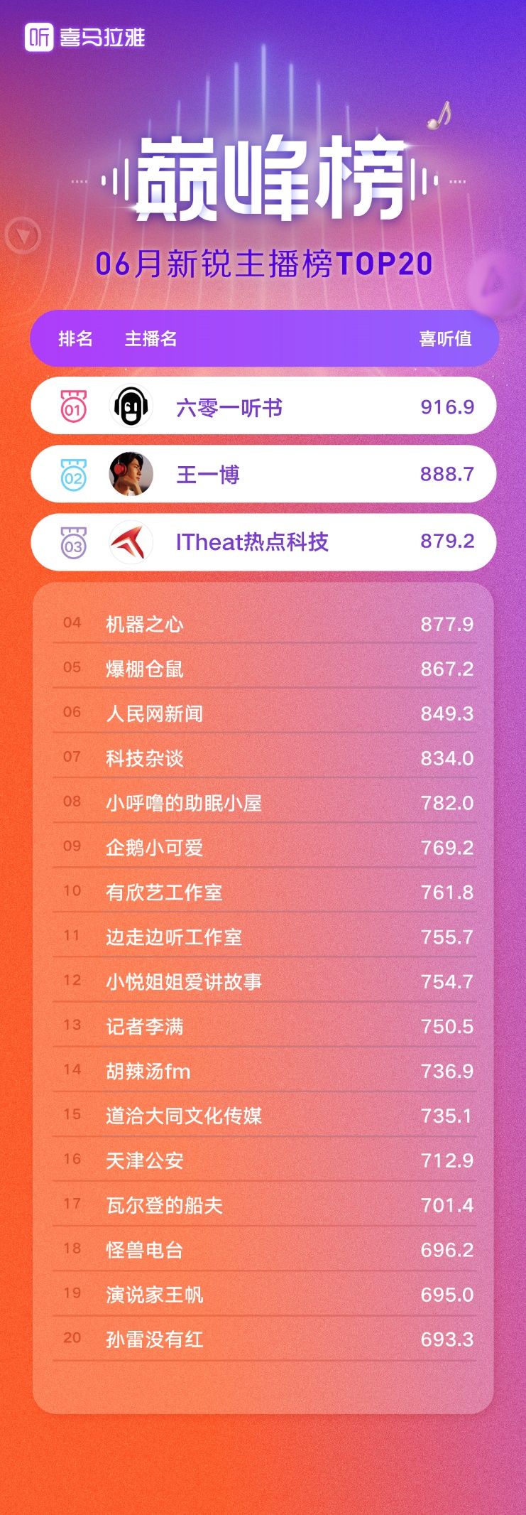巅峰榜是喜马拉雅推出的官方榜单。秉持着“发现好内容、好主播”的宗旨,巅峰榜基于点播热度、互动分享、付费率等指标,对主播和专辑进行月度排名。在6月,《安全警长啦咘啦哆|宝宝巴士故事》斩获新品热播榜TOP1,六零一听书成为新锐主播榜TOP1,《吴晓波马红漫领讲:新中产财富课》拿下新品畅销榜第一名。