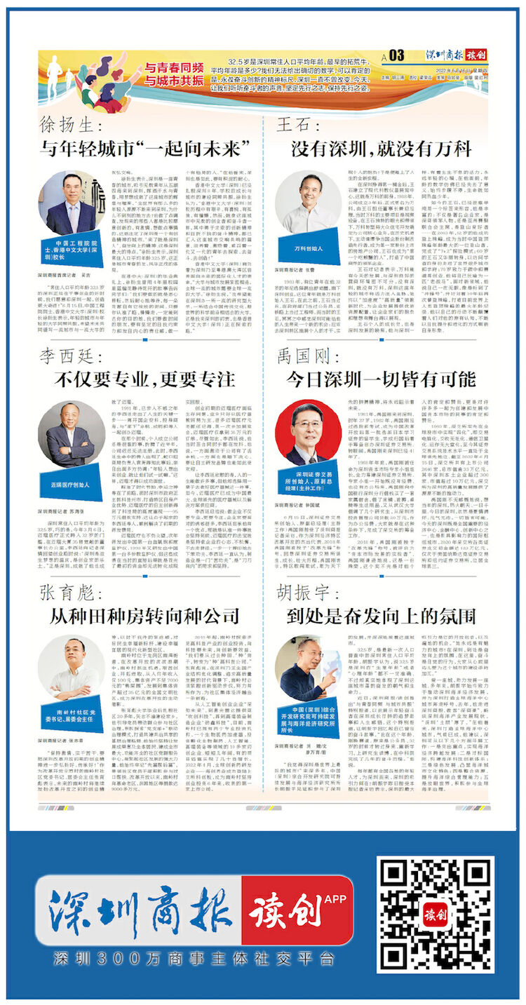 近日,深圳商报/读创推出“与青春同频与城市共振”特别报道,以此展示年轻奋斗者在深圳成长打拼的追梦故事和人生感悟。这个特别报道,让胡振宇回忆起自己曾经的奋斗故事。“我在这个年龄,刚换赛道。原来是公务员,32岁的时候才转过身来,重新学习,上研究生读博,在中科院完成了几年的奋斗历程。”他说。