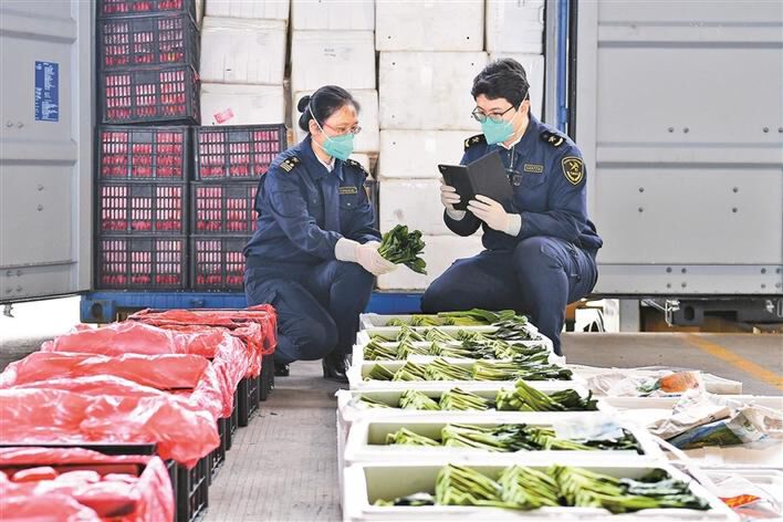 深圳开通“海上快线”全力保障香港生活物资供应,这是深圳海关工作人员查验供港蔬菜。新华社发