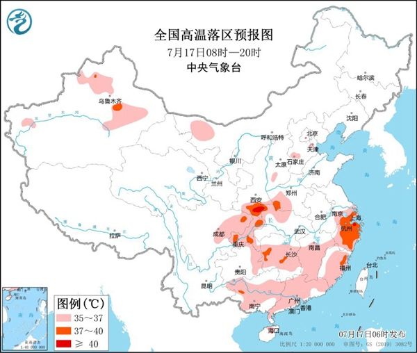 预计7月17日白天,新疆北疆沿天山一带和吐鲁番地区、陕西南部、山西南部、河北南部、北京南部、江汉北部、江南大部、华南大部、西南地区东部等地有35℃以上高温天气,其中,新疆吐鲁番地区、陕西东南部、河南西南部、上海西部、浙江大部、福建东北部、湖南中西部、重庆北部和南部等地的部分地区最高气温37~39℃,陕西东南部、浙江东北部局地可达40℃以上。