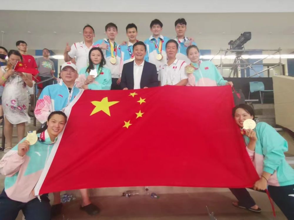 本届世运会,中国体育代表团一行共73人参加了无人机、保龄球、霹雳舞、荷式篮球、壁球、蹼泳、滑水、武术等8个项目的比赛,其中蹼泳和武术表现尤为亮眼。蹼泳队为中国代表团贡献5金4银1铜,舒程静、胡瑶瑶、陈思佳、许艺川更是以1分08秒95夺得女子4X50米接力冠军,创造了新的世界纪录。