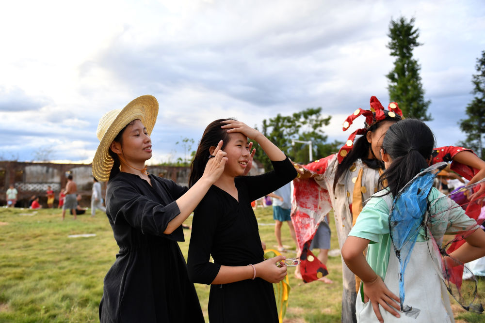 今年7月,附近村庄和邻近县市的70多个孩子参加了大元社的暑期活动,在完成基本学业之余,学习手工、绘画、音乐等艺术相关课程。8月20日傍晚,孩子和村民们一起举办的艺术节便是“结业典礼”。为了准备艺术节的重头戏——沉浸式戏剧,孩子们自己打磨剧本、设计服装、调试灯光,40多个孩子穿着自己设计的服装,期待着属于他们的乡村艺术节。