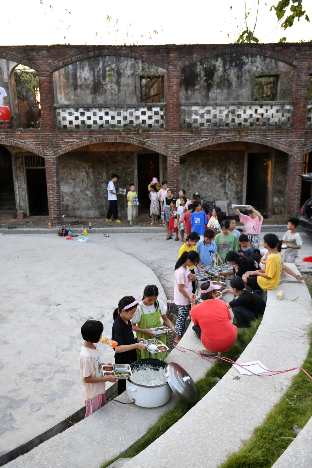 ↑8月19日,孩子们在戏剧排练后排队吃晚饭。