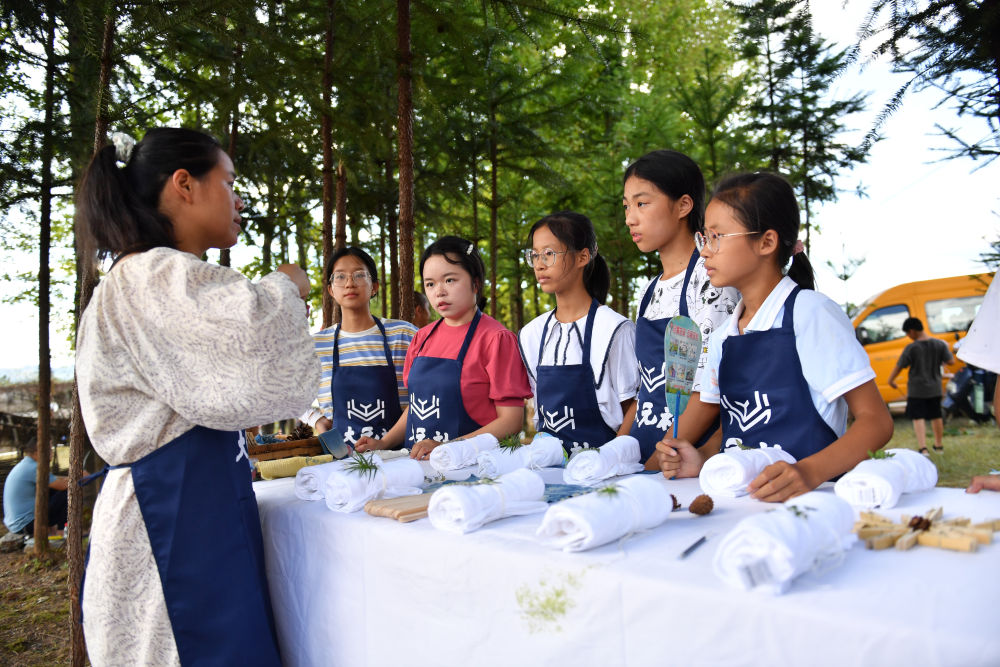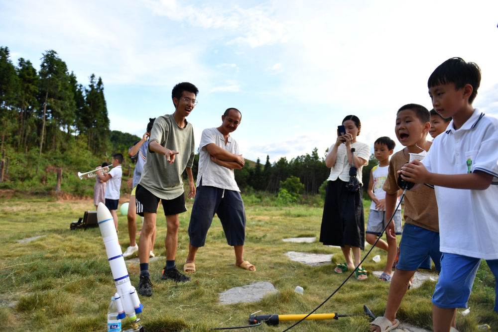 ↑8月20日,孩子们在志愿者的带领下体验“火箭发射”。