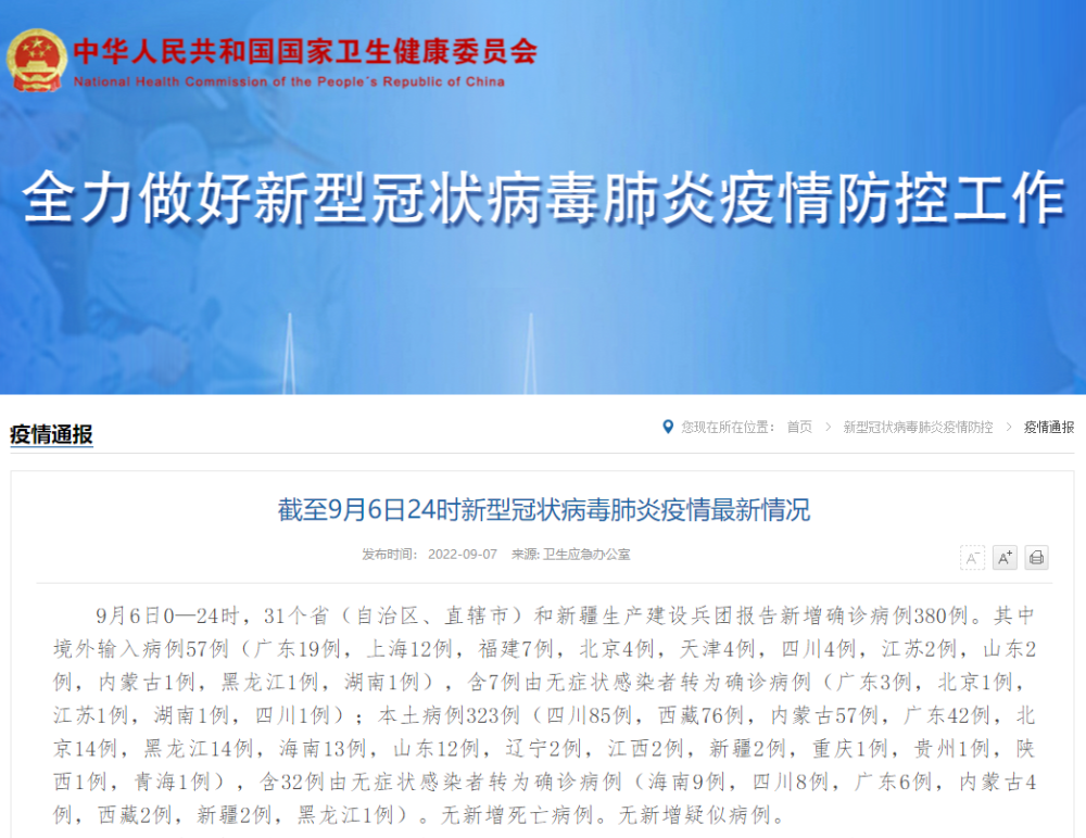 9月6日0—24时,31个省(自治区、直辖市)和新疆生产建设兵团报告新增确诊病例380例。其中境外输入病例57例(广东19例,上海12例,福建7例,北京4例,天津4例,四川4例,江苏2例,山东2例,内蒙古1例,黑龙江1例,湖南1例),含7例由无症状感染者转为确诊病例(广东3例,北京1例,江苏1例,湖南1例,四川1例);本土病例323例(四川85例,西藏76例,内蒙古57例,广东42例,北京14例,黑龙江14例,海南13例,山东12例,辽宁2例,江西2例,新疆2例,重庆1例,贵州1例,陕西1例,青海1例),含32例由无症状感染者转为确诊病例(海南9例,四川8例,广东6例,内蒙古4例,西藏2例,新疆2例,黑龙江1例)。无新增死亡病例。无新增疑似病例。