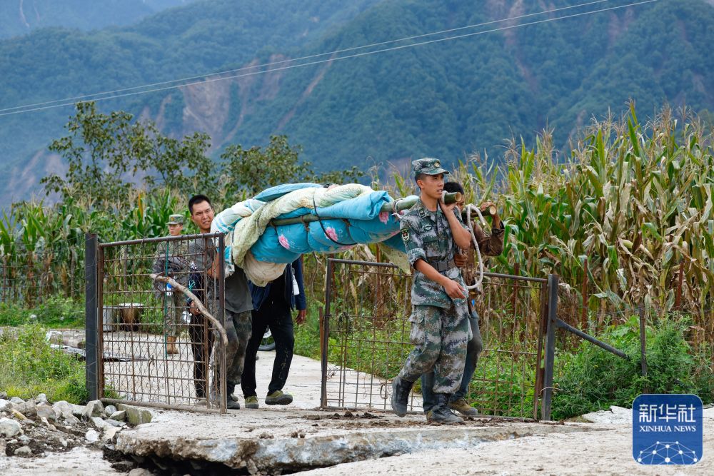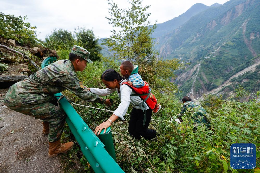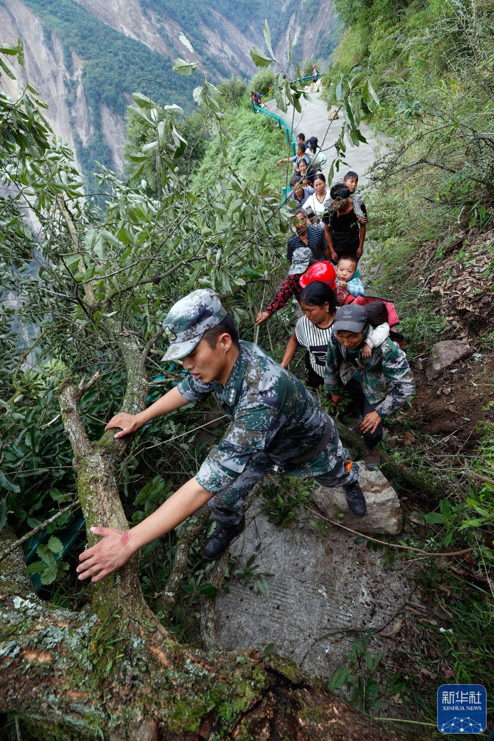 9月6日,救援人员帮助泸定县得妥镇湾东村村民向外疏散。新华社记者沈伯韩 摄影