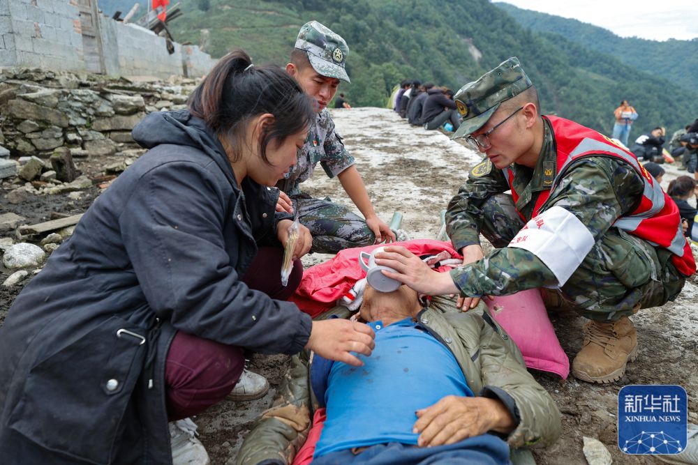 9月6日,救援人员给一名从泸定县得妥镇湾东村疏散出来的受伤村民喂水。新华社记者沈伯韩 摄影