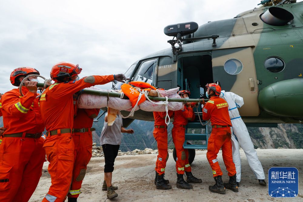 9月6日,救援人员抬着一名从泸定县得妥镇湾东村疏散出来的受伤村民,准备通过直升机将其运出。新华社记者沈伯韩 摄影