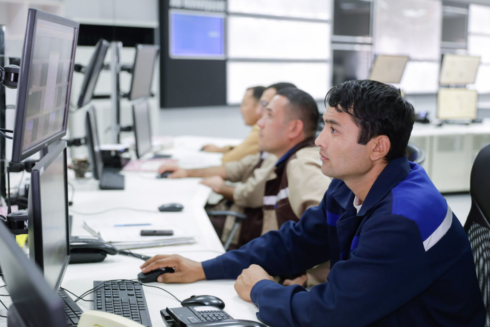 图为8月18日在乌兹别克斯坦纳沃伊市的纳沃伊氮肥股份公司,乌方工作人员监控聚氯乙烯生产。新华社发(奥斯帕诺夫摄)