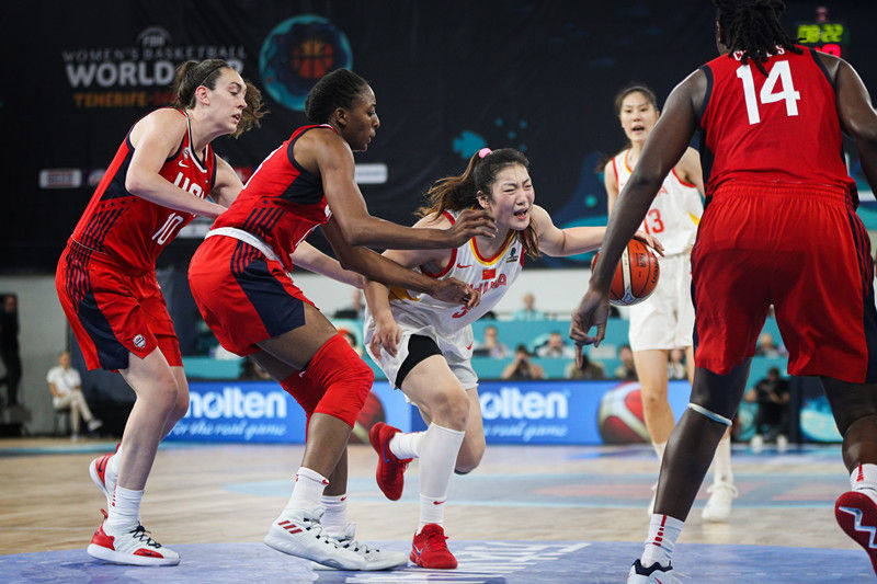 2018年9月23日,中国队球员李梦(中)在比赛中突破受阻。当日,在西班牙特内里费岛举行的2018年国际篮联女篮世界杯小组赛中,中国队以88:100不敌美国队。新华社记者 郑焕松 摄