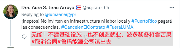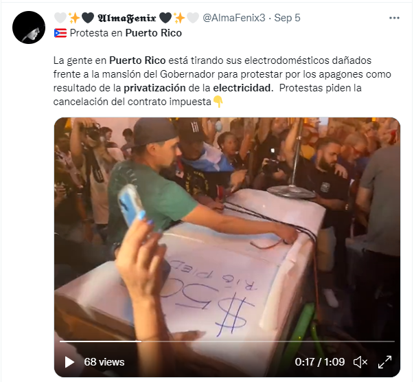 除了在互联网上表达不满,波多黎各人走上街头,组织了大规模抗议活动,要求政府取消与鲁玛能源公司的合同,批评电力运营私有化正在剥夺他们的幸福生活。