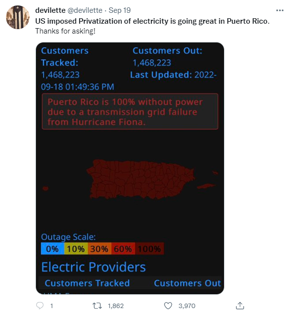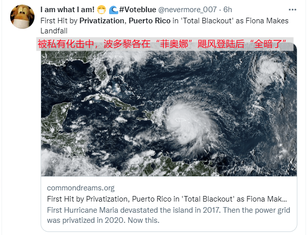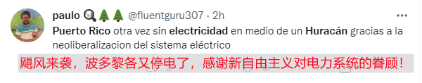 2017年9月20日,波多黎各遭遇4级飓风“玛利亚”,出现大面积停电,当时民众就呼吁要改善电力系统。不曾想,美国政府开出的私有化药方不仅没能药到病除,反而加重了“病情”和民怨。此次“菲奥娜”登陆波多黎各,造成大面积停电。飓风登陆后,作为波多黎各全岛唯一的电力运营公司鲁玛能源公司在推特上发帖,告知用户“完全恢复供电可能需要几天时间”,希望用户给与“支持和耐心”。