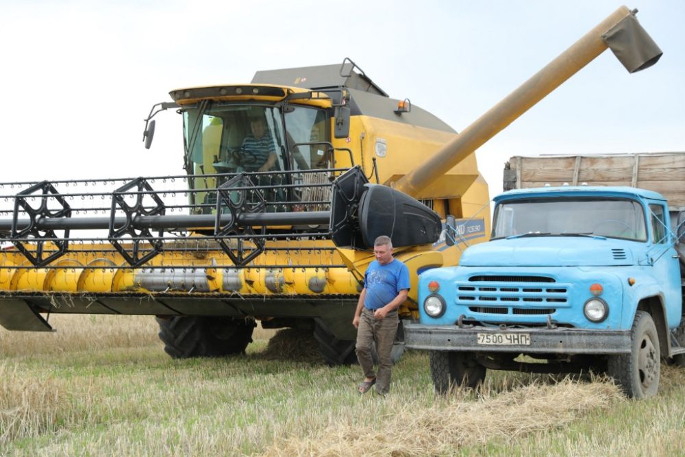 7月30日,收割机在乌克兰切尔尼戈夫州一座农场收割麦子。(新华社记者李东旭摄)