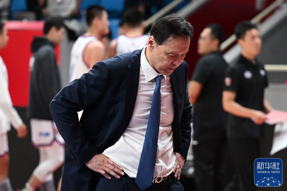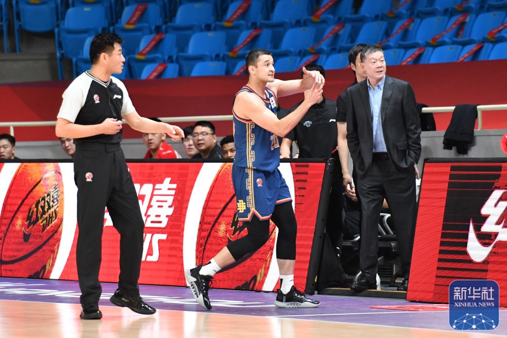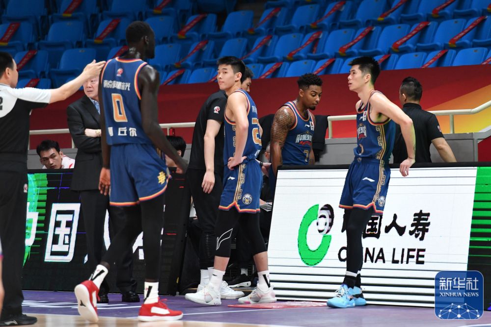 南京同曦宙光队主教练兼球员西热力江(左二)申请暂停。