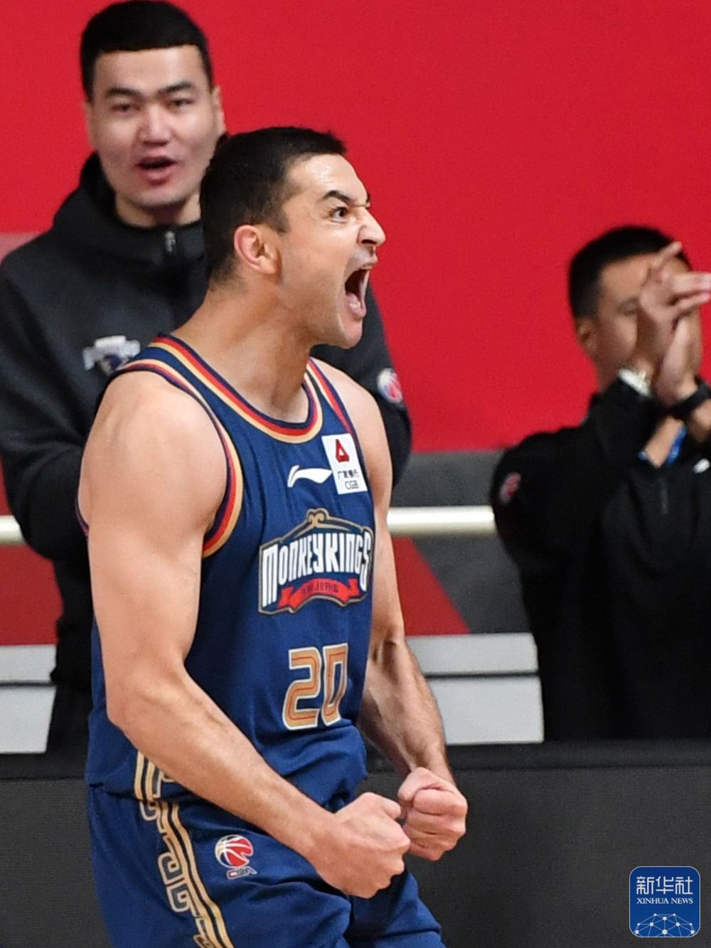 南京同曦宙光队主教练兼球员西热力江(前)在进球后庆祝。