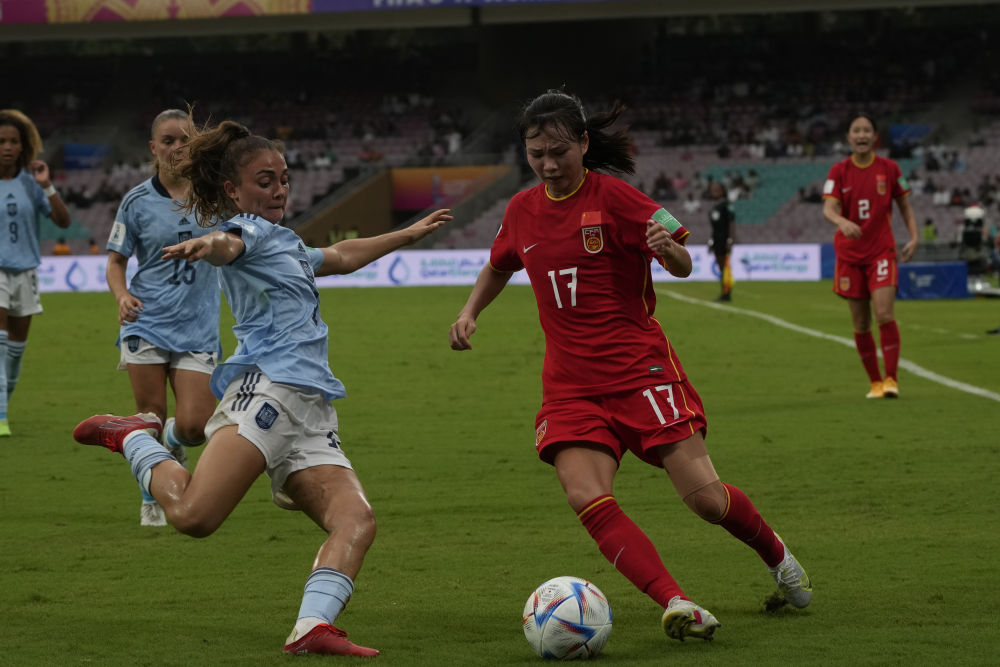比赛开始后,由于净胜球劣势必须获胜才能确保出线的中国队打得有些被动,好在门将刘晨高接低挡,屡次化解对方的威胁球。不过西班牙队在第61分钟还是通过定位球取得领先,阿特罗利用角球机会头球破门将比分改写为1:0。第79分钟,中国队也曾打进一球,可惜黄嘉欣在禁区内的抽射被判越位在先。