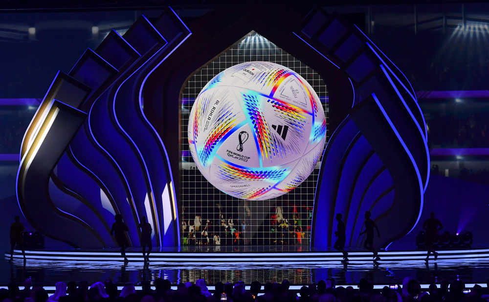 ↑2022年4月1日,卡塔尔世界杯抽签仪式现场大屏幕上展示官方用球。新华社发(尼库 摄)