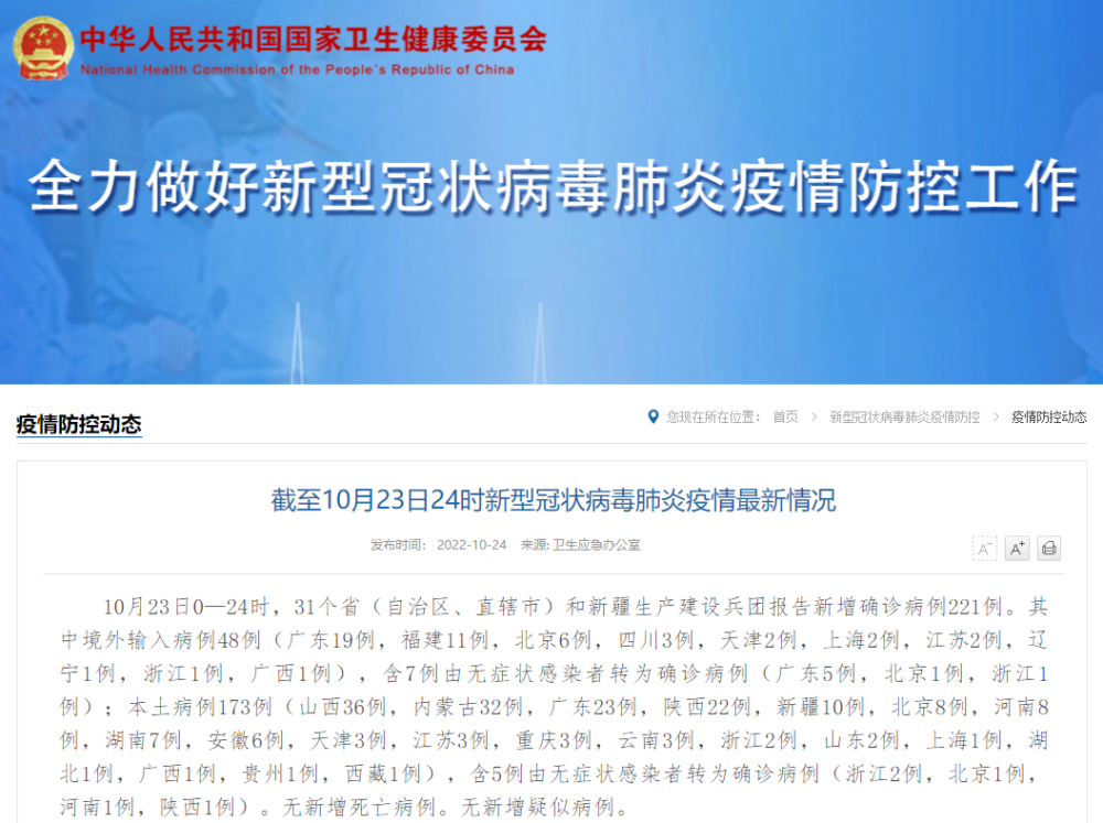 10月23日0—24时,31个省(自治区、直辖市)和新疆生产建设兵团报告新增确诊病例221例。其中境外输入病例48例(广东19例,福建11例,北京6例,四川3例,天津2例,上海2例,江苏2例,辽宁1例,浙江1例,广西1例),含7例由无症状感染者转为确诊病例(广东5例,北京1例,浙江1例);本土病例173例(山西36例,内蒙古32例,广东23例,陕西22例,新疆10例,北京8例,河南8例,湖南7例,安徽6例,天津3例,江苏3例,重庆3例,云南3例,浙江2例,山东2例,上海1例,湖北1例,广西1例,贵州1例,西藏1例),含5例由无症状感染者转为确诊病例(浙江2例,北京1例,河南1例,陕西1例)。无新增死亡病例。无新增疑似病例。
