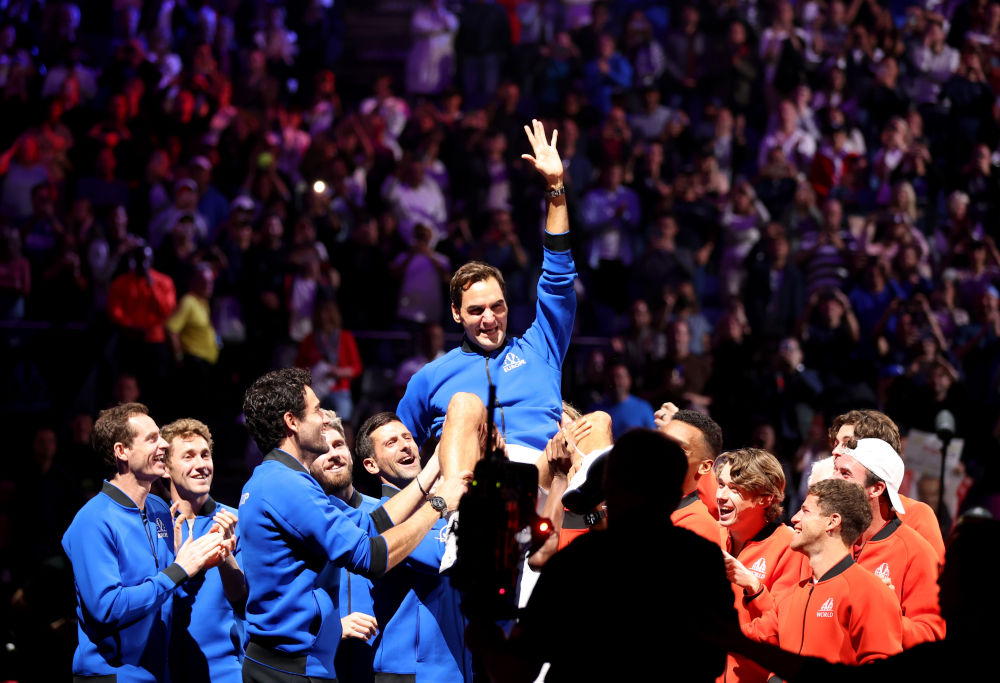 9月23日晚,费德勒在伦敦举行的拉沃尔杯网球赛上完成职业生涯最后一场比赛后,正式退役。选手们在赛后将费德勒(上)举起。新华社记者李颖摄