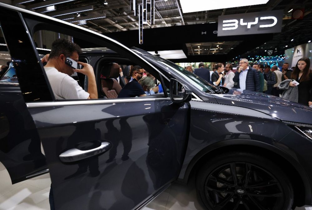 10月18日,在法国巴黎凡尔赛门展览中心举行的巴黎国际车展上,人们在比亚迪展区参观。新华社记者高静摄